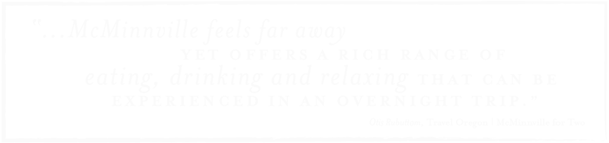 Nestled in the heart of Oregon’s wine country, on the native Kalapuya lands, you’ll find McMinnville, Oregon: a warm, inviting, and genuinely friendly destination. Whether it’s the nostalgic feeling of walking below the twinkle-light filled trees lining the historic downtown or enjoying some of the world’s best Pinot noir, you’re sure to experience the warmth of the people you’ll meet in McMinnville. Farm-to-table restaurants, shopping, wine tasting, arts and culture, and lodging experiences as welcoming as the town itself are waiting for you in McMinnville.