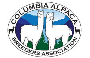 A logo for Columbia Alpaca Breeders Association. It has two white illustrated alpacas standing in front of a blue, purple and green background.