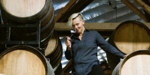 A woman stands in front of wine barrels. She has a glass of white wine in her hand and she smells it.