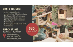 A flyer with a collage of pictures of an adult and child building a birdhouse.